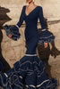 Traje con escotes medios. Mangas con volante de vuelo con detalles en tono beige o negro. La falda con vuelo y detalles en beige o negro. Diseñado y fabricado en España.